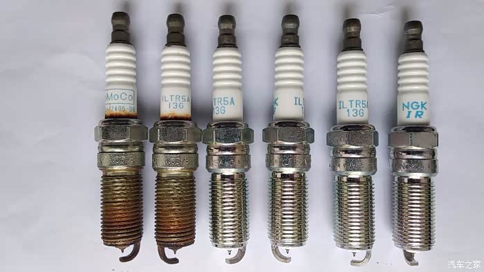 新旧火花塞合影,型号相同,均为ILTR5A-13G,所不同的是:新的为NGK,旧的为FoMoCo(福特),但均为NGK生产。