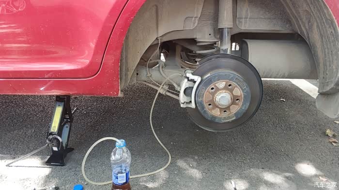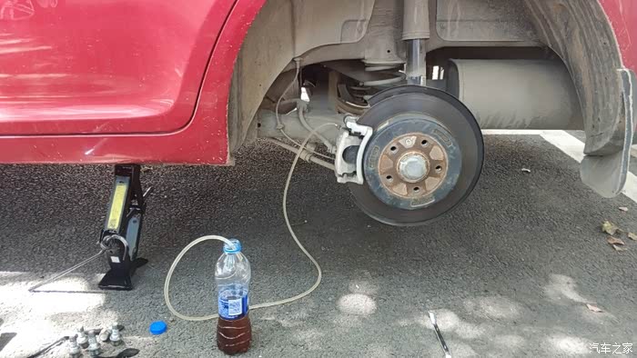 更换左前轮就没有拆轮子了,非常方便快捷、只需要连接好软管,松动螺丝、然后提前给储液壶加好制动液,只需要将车辆起动后、踩制动踏板就可以看到软管的旧制动液流出,看到流出新的制动液就可以不用踩了。