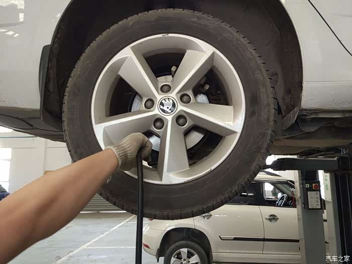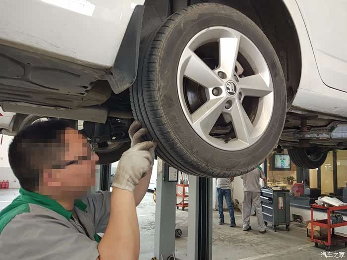 随后,师傅又将小明升起,对轮胎也认真进行检查,将小石子一个一个抠出。