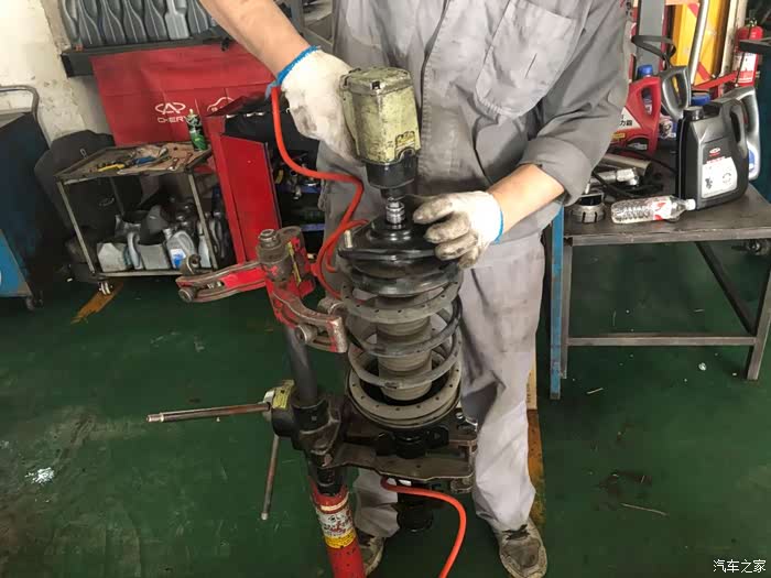 拆卸掉有问题的减震器,用专业工具将新的减震器组装好。