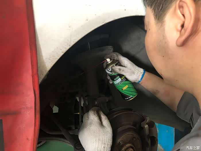 支撑杆螺栓有锈蚀,师傅再喷润滑剂。