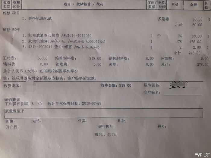 费用:第十次保养,5万公里更换的178一桶的矿物质油,机油滤芯38,垫片2块,工时费60元,共计花费278元!