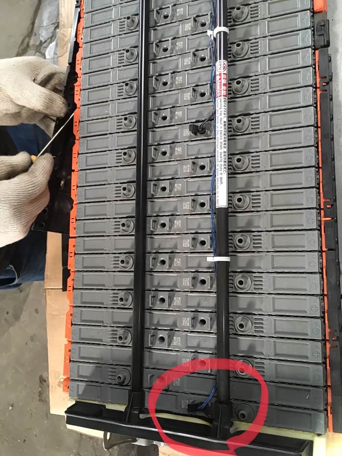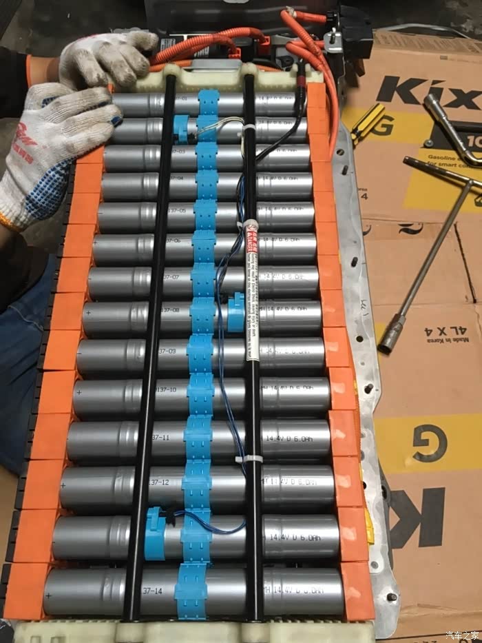 每组由3条圆柱体电池连接起来,相当于原车的两片一组,每组14.4V。(上图电池有点错位,可能是在电池返厂维修的运输过程摔的,经厂家检测调整后重新寄出,已安装上了。