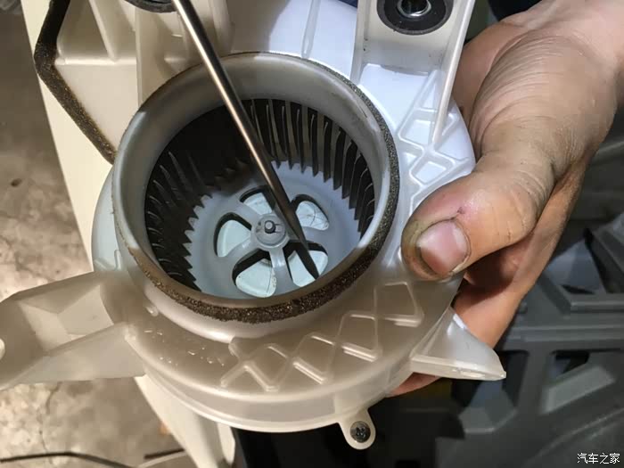 第一次拆装图;清洁鼓风机,有长头发缠住。我是很少开窗行驶,还是脏。若是经常开窗行驶的,建议定期清洁进气通道和鼓风机,提高散热效果