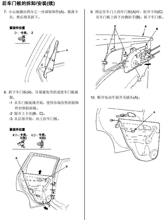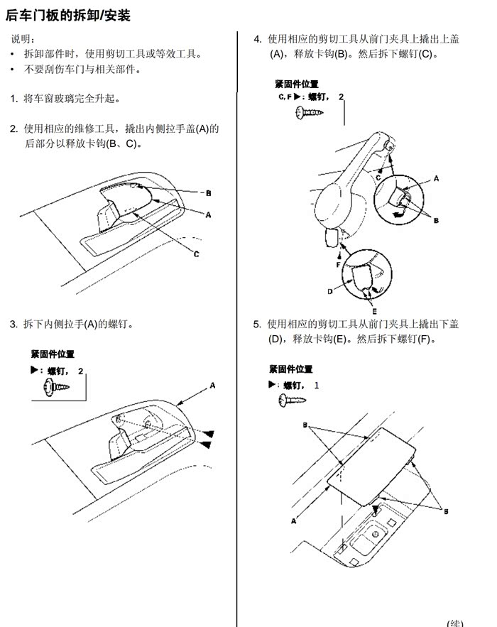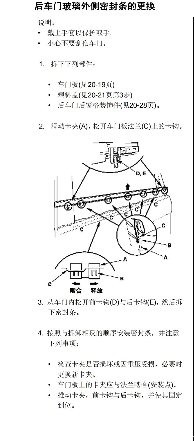 F.打开钥匙门,将玻璃放下,从后门板下部向外台30度角,将门板向上提。让饰板从玻璃夹缝中提出。提出后不要离开太大距离。