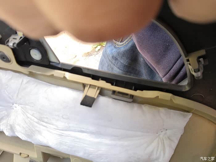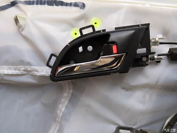 G.将内饰板拉锁拉杆开关从门板中分离。从门板和玻璃中间可以看到拉锁反面用手指向自己胸口推,直接突出,拉锁和门板分开。