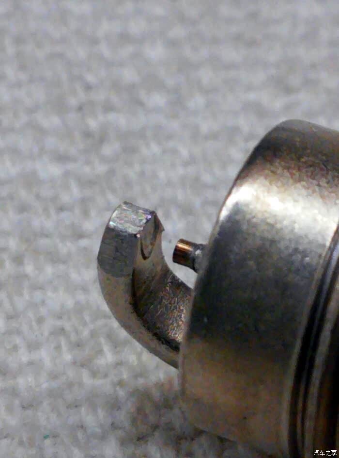 火花塞最值钱的两粒铱金。注意看侧电极上熔接的那块是平的。