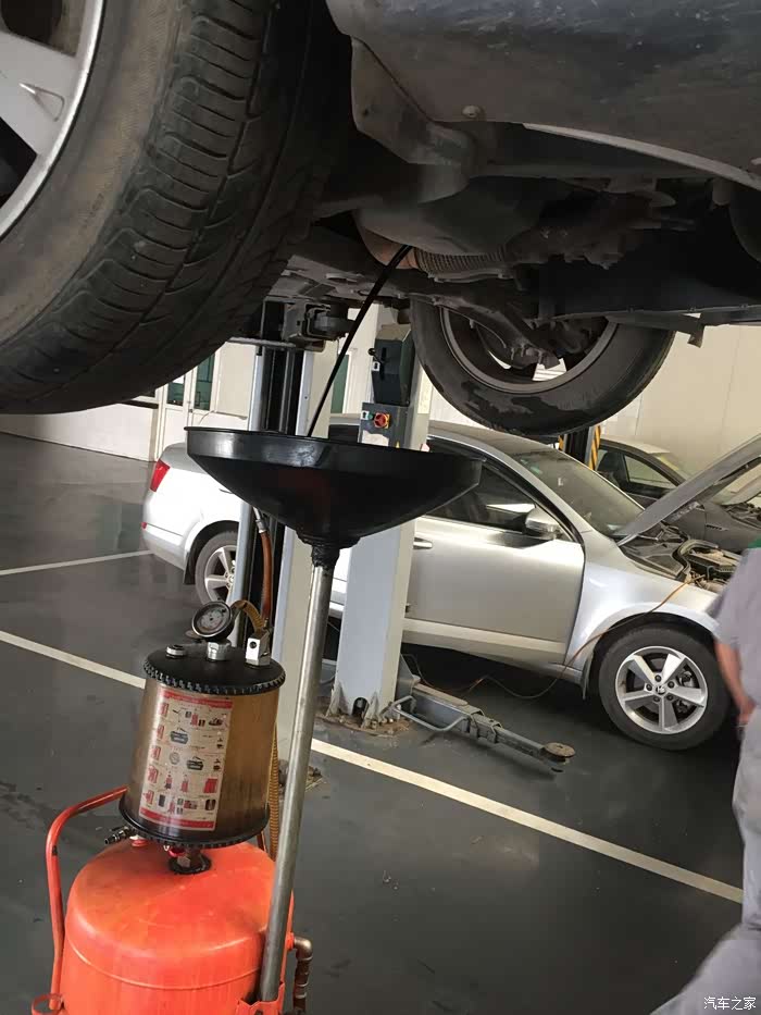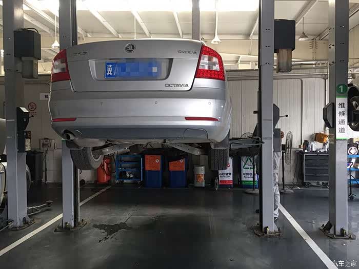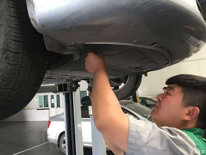 机油放干净后,上紧油底壳螺丝,安装护板,车子落下升降机。