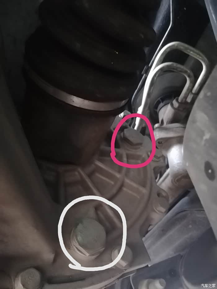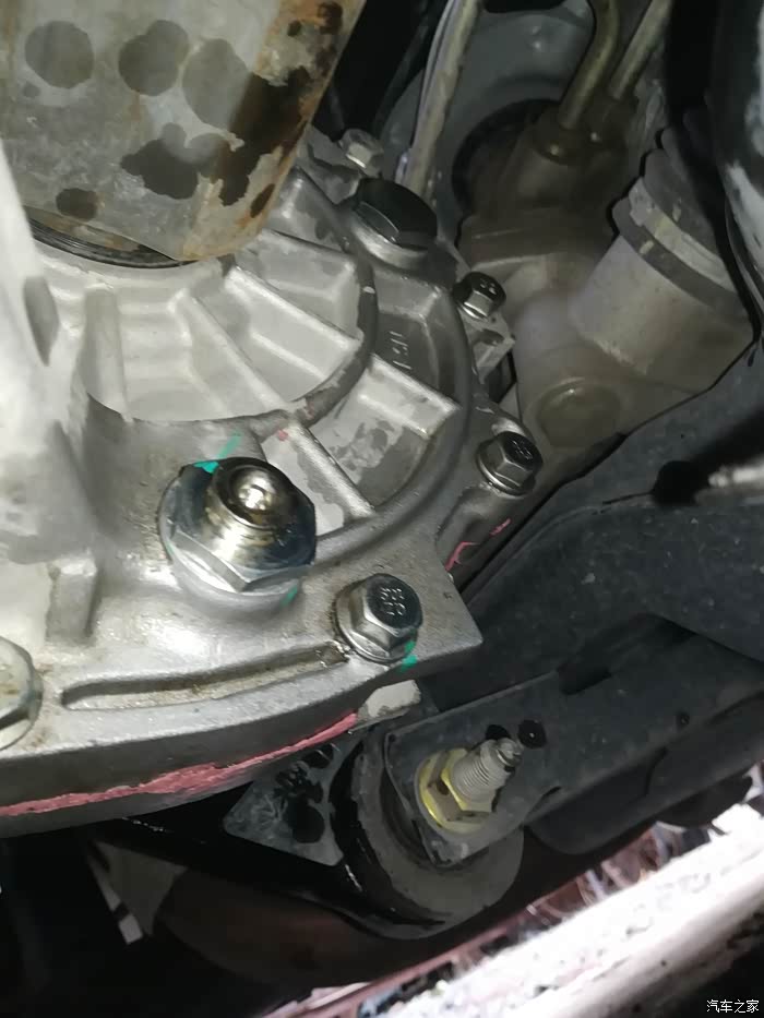 图中,白圈是放油螺栓,粉圈是加油螺栓。这个,我研究了好久才搞明白。