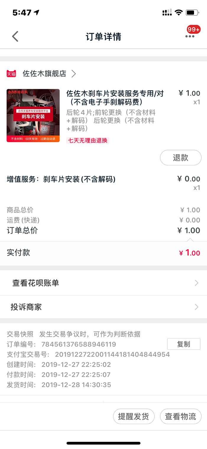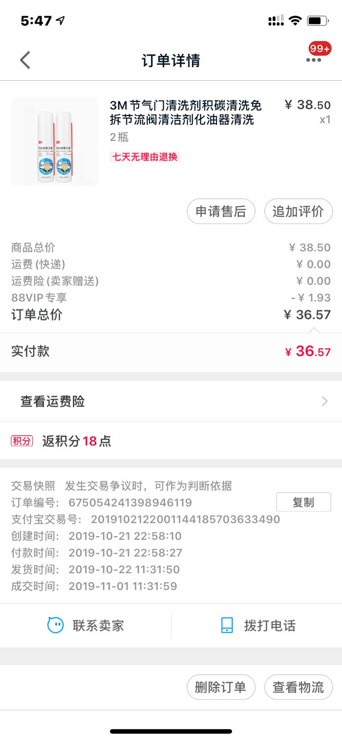 19年双十一某猫买的,很便宜,今天工时费也不多,总之,我养迈腾,费用都很低