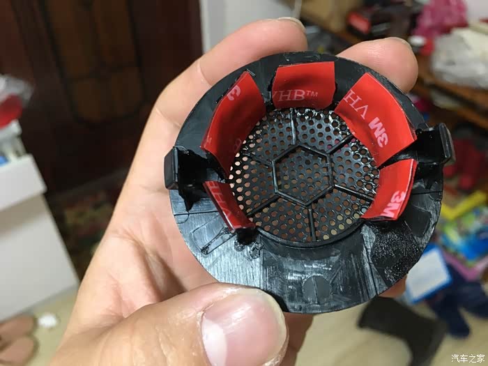 喇叭攮进去后~由于3m胶的基材很软韧,因此是有弹性余量的。可以再微调下位置。然后用夹子夹住,压一阵子~~毕竟人家是压敏胶嘛,我压了一宿。