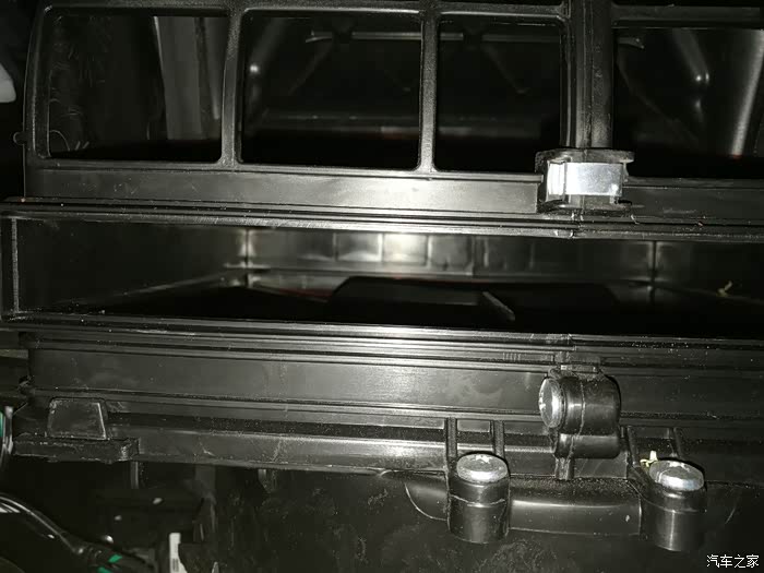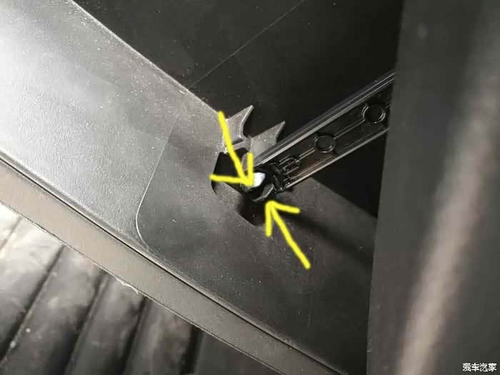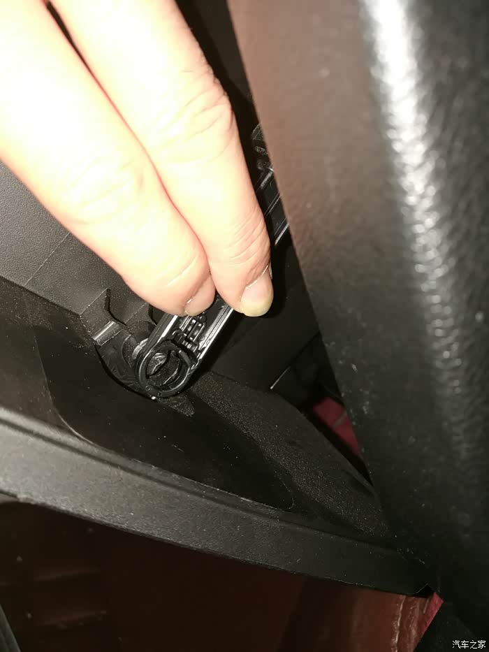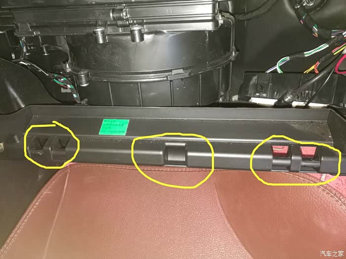装完后,该装回手套箱了。这是手套箱后边,把黄色圈圈装到下图对应的位置,此时手是不能松开的,一松手套箱就掉啦,或者用腿顶着也行,反正不能让掉下来,哈