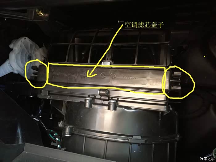 图示圆圈位置为固定空调滤芯盖子的位置