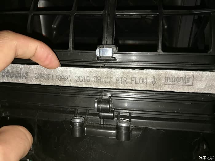 取下盖子后,就可以看到空调滤芯。然后用手如下图所示拉出滤芯。