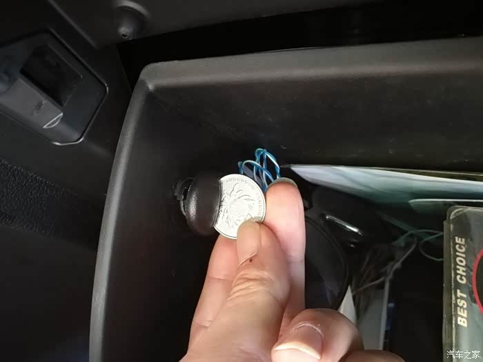 打开手套箱,你会看到两边各有一个塑料螺丝,用一元硬币就可以拆掉。(左边的塑料螺丝,逆时针或顺时针拧90度,一拔就出来了。)