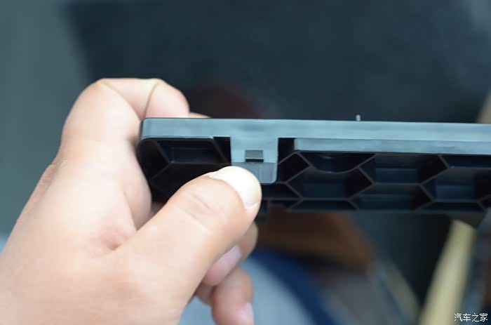 盖板有三个卡扣,在我拇指的位置使劲往下按听到哒一声就表示脱落了,依次按开三个卡扣,按不动要稍微使点力气,第一次弄还是蛮费力气的,拆出来后就能看到空调滤芯了。
