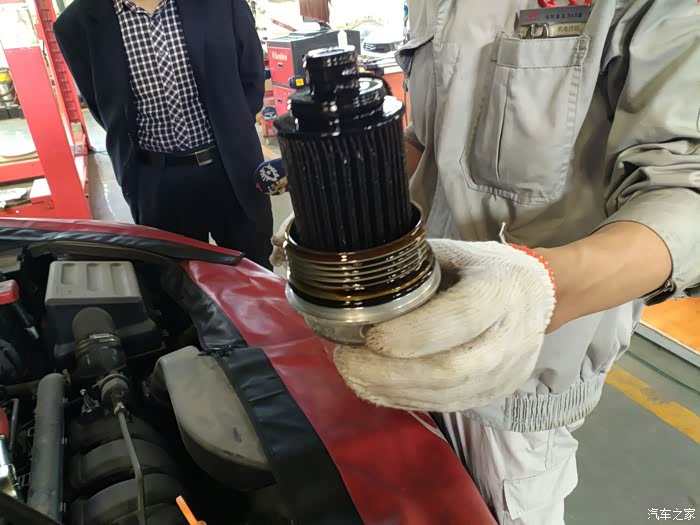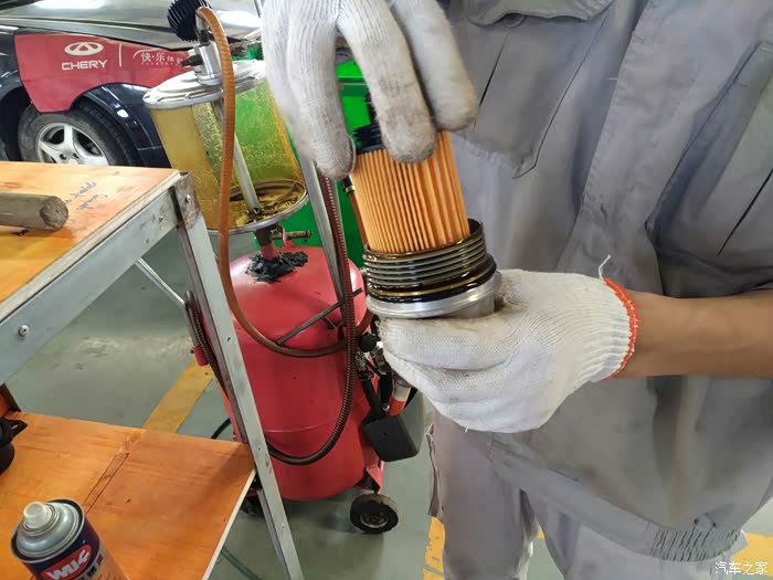 车子被放到了地上,维修技师开始拆卸机油滤芯