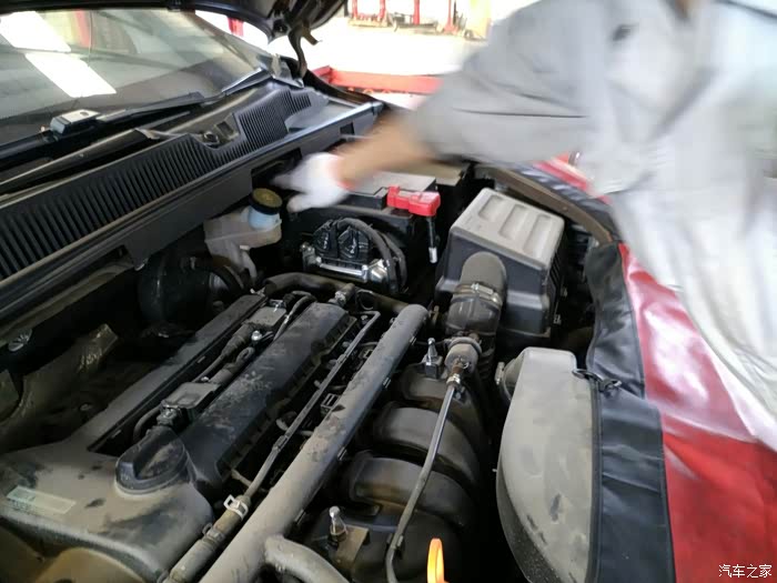 机油加好,技师又开始用高压气枪清理发动机舱灰尘,旁边是空气滤清器总成