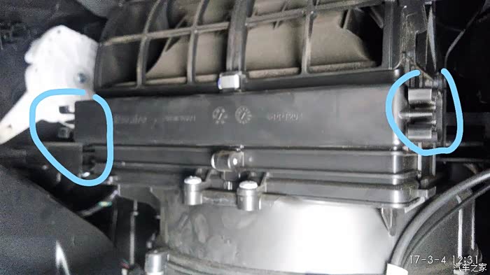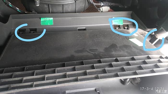 就是这里,就是空调滤芯所在的地方了,注意两边两个卡扣,需要同时用手捏住然后才能取下来。
