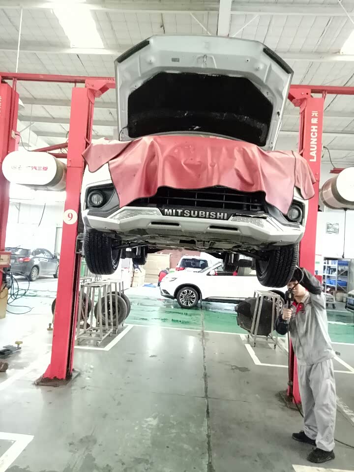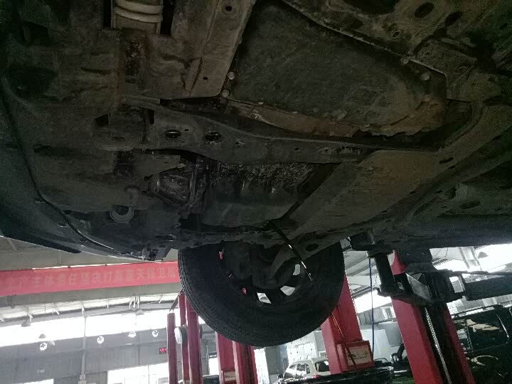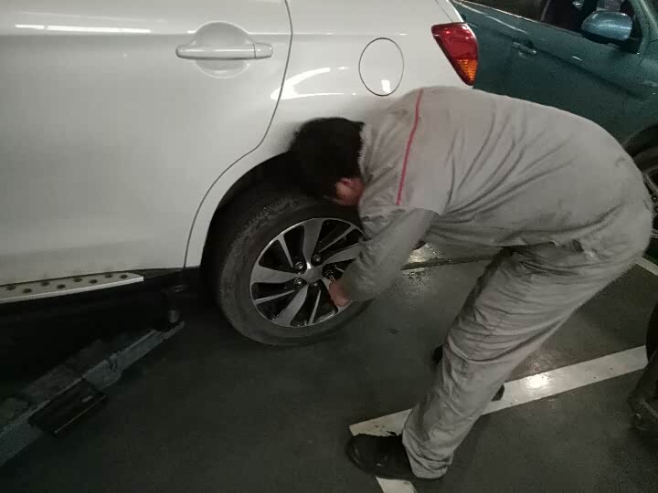 将车升起检查胎压 充气及轮胎外观 刹车,师傅检查的蛮仔细的啊!