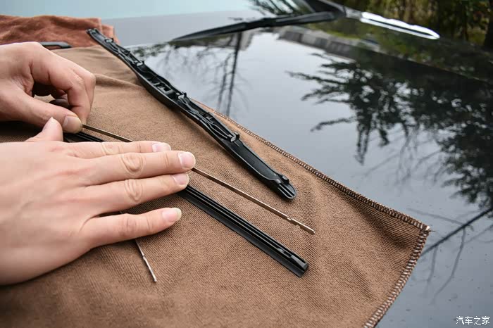 把钢条上到新的胶条上面,这时的步骤和拆卸雨刮胶条相反。