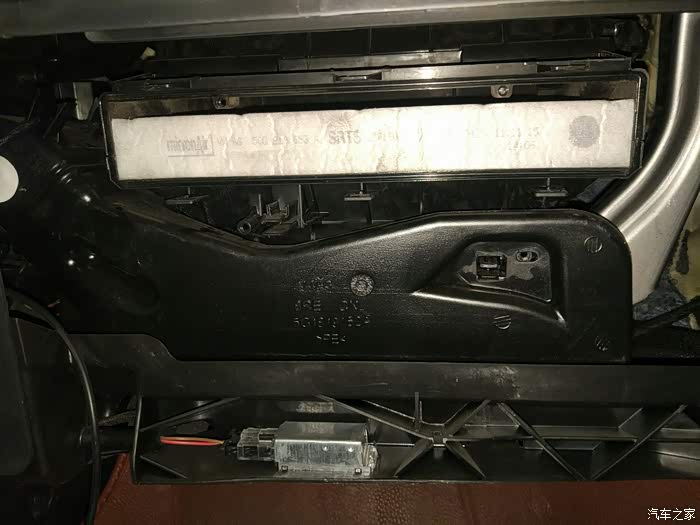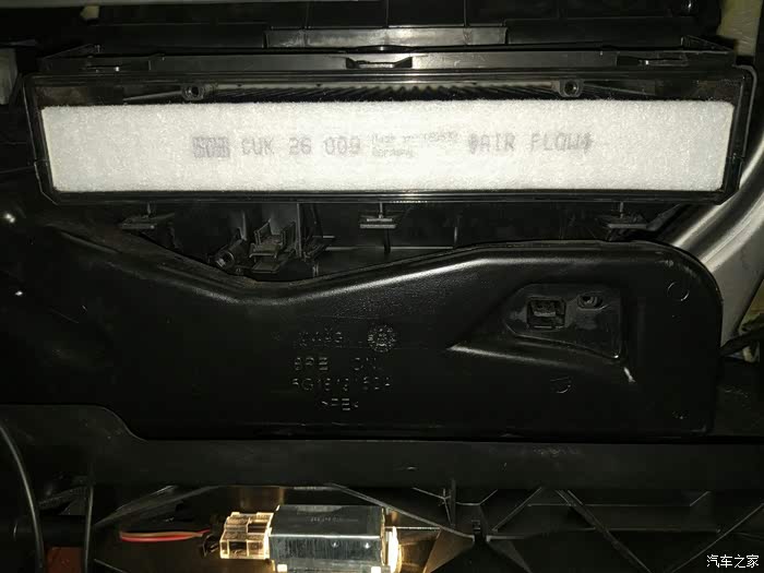 擦擦四周,开大风吹吹,放入新滤芯&有字的一面朝外安装过程就不详解了,滤芯挡板上三个、手套箱下面两个和右边一个,一共六个卡子卡到位,反顺序装上就可以了