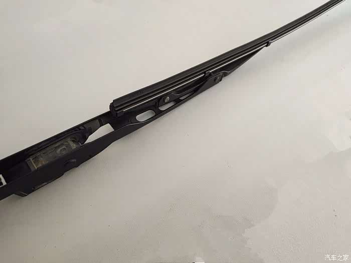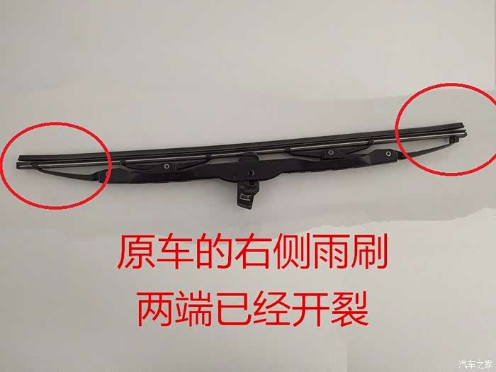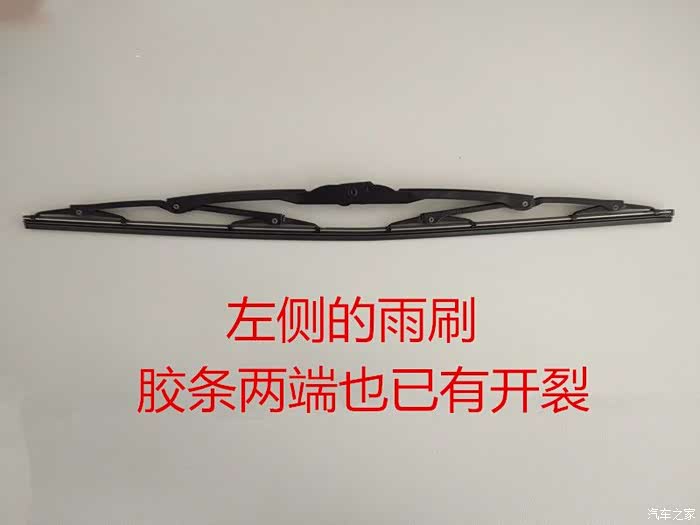 拆下的原车雨刷,右侧雨刷胶条两端已开裂
