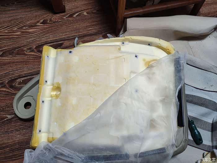 更换前也参考了不少论坛上其他车型的车友更换海绵垫的作业,很多会选择在海绵底部增加一个硬质垫子,不过我拆下海绵后发现老海绵底部并没有陷入弹簧钢丝的情况,也就没有垫准备好的垫子,主要还是上面软性海绵出现的问题,在下面垫东西可能解决不了太大问题,回头装车如果觉得还是不舒服可以考虑垫上看看,毕竟已经拆过一次轻车熟路了,哈哈。