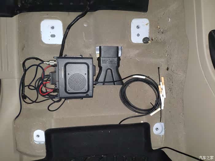 座椅搬走还挺奇怪的。电台馈线通过B柱装饰板上顶,从后备箱右上方橡胶塞出,我认为这是撼路者比较理想的走线方式了,用卡边或者吸盘都不错。