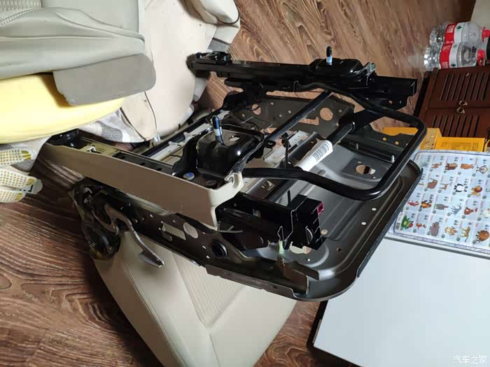 拆下坐垫海绵,座椅框架无任何锈痕,似乎质量还凑合。拆塑料包围的难点可能在座椅高低调整把手那里,需要用小一字改锥从内测拨开卡扣,方能取出塑料把手,取下后基本没什么难点了,拿电筒看清楚即可比较方便的拆下两侧塑料包围。