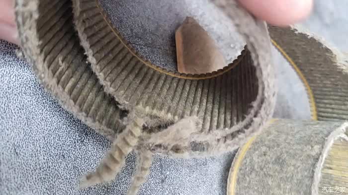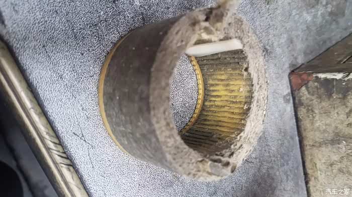 取出滤芯,看到有多脏了吧,原滤芯颜色黄色,这个直接黑,虽然也有汽油还没完成干的问题,但是改变不了脏了。。纸也变化了,毕竟三年9万公里。