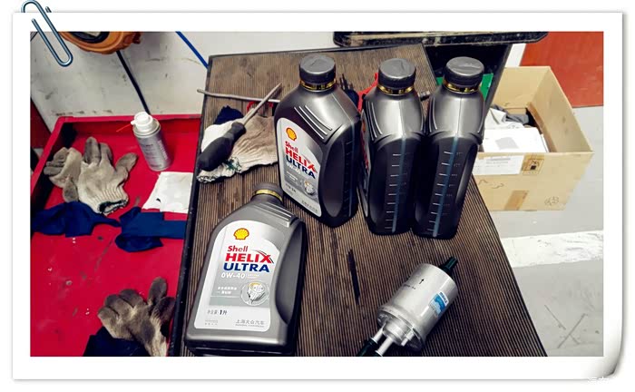 此次保养用到的黑钻机油和汽油滤芯,机油滤芯已经换好了。机油都是1升装小桶,本以为会是4升装的大桶
