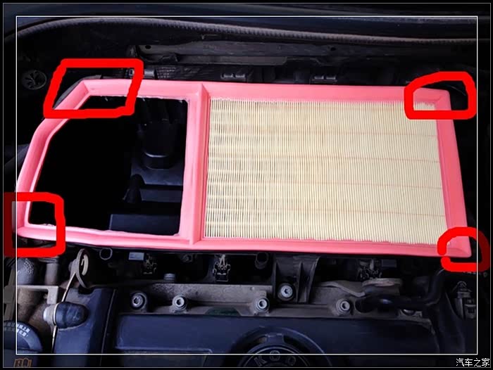 换入新的空气滤清器,注意四个角,把空气滤清器完全安装在滤芯盒子内。