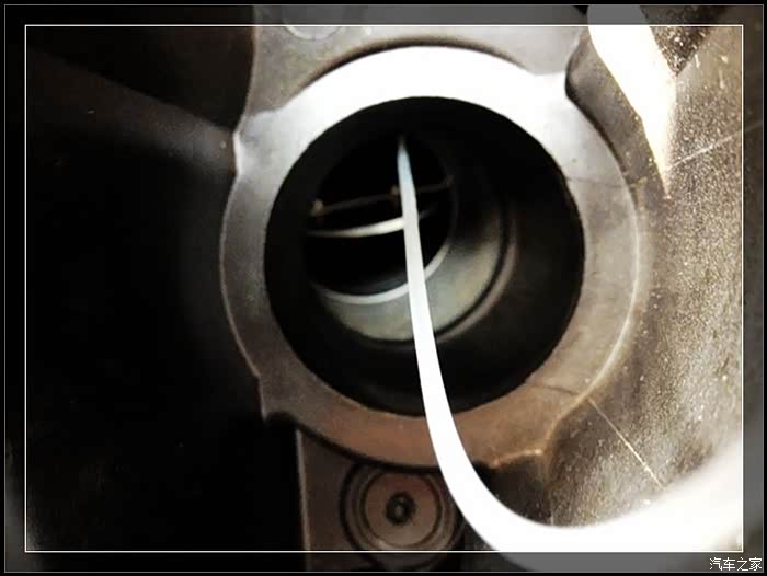 然后轻踩油门,将节气门打开一定角度,把导管深入节气门内持续喷洒5-10秒。从图片可以看到节气门扇叶的积碳已经清洗干净了。最后怠速5-10分钟,将溶液吹干