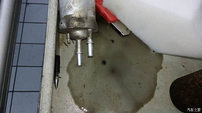 拆下来后,少许汽油洒落在地上,颜色已经不是无色透明了