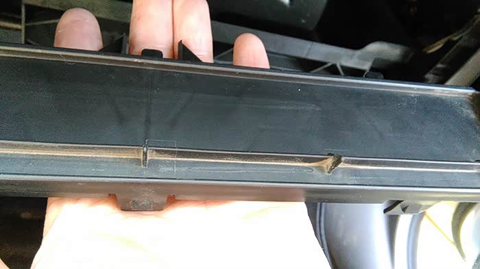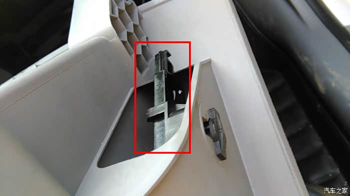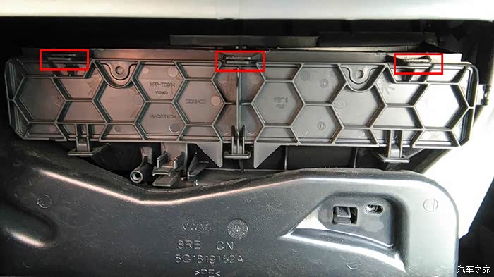 打开之后,我们就可以看到空调滤芯的面板,看到红色框了吗,上面三个只要每个下端的往外拉一点点就能取下来!虽然不好用力,第一次之后,以后换就更简单!