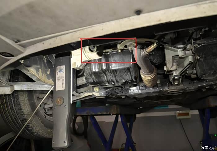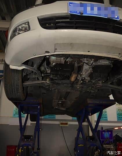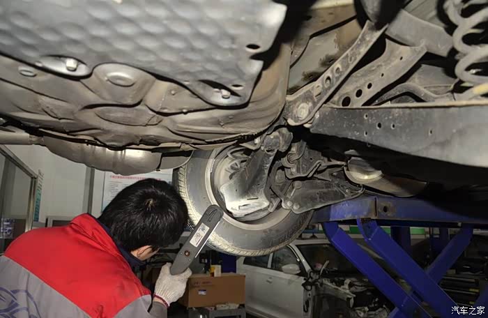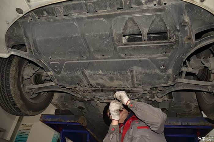 接下来,技工小哥又把车子升上去,要为我检查一下地盘了