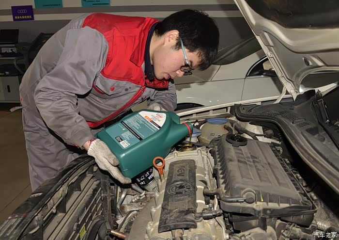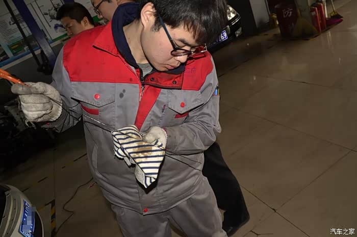 正在补填机油,技工小哥好认真。