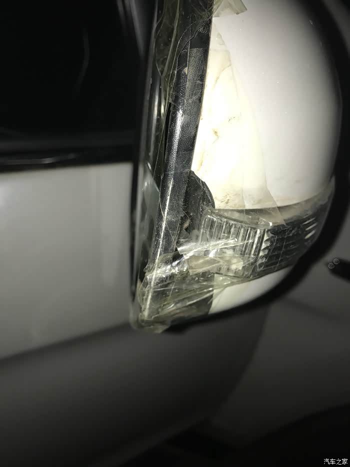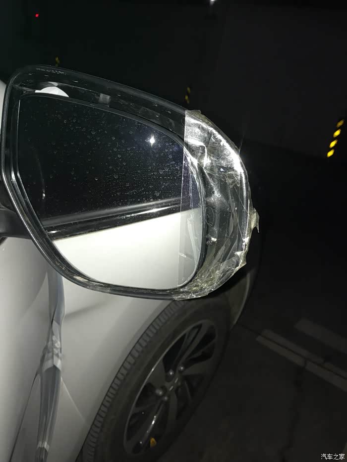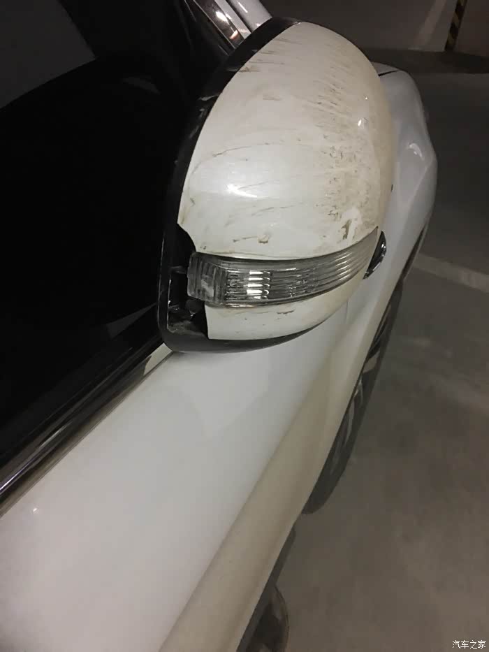 雨天路滑,小白一不小心就受伤了,后视镜直接擂到墙上去了,镜片都掉出来了,心疼!