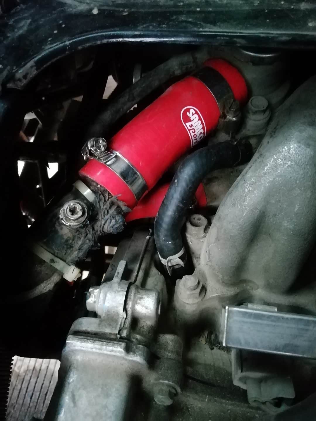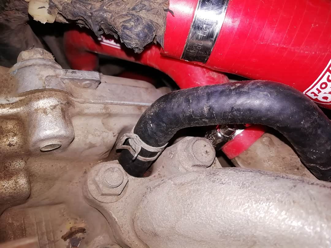 下面带弯的最难换,上面那个靠排气螺丝的那根,教大家一个技巧,对比切好尺寸,穿入卡子抹点水然后安排气螺丝这边,安到底,然后双手上提折起来,对准节温器这边使劲一推就安上了,