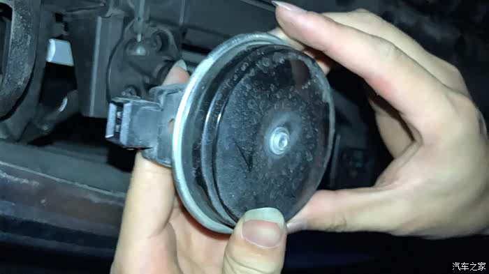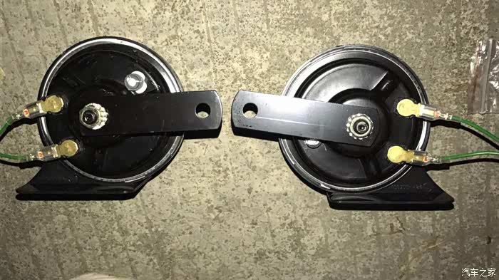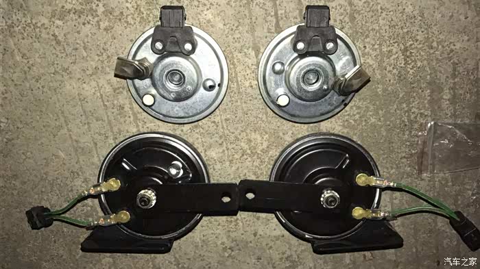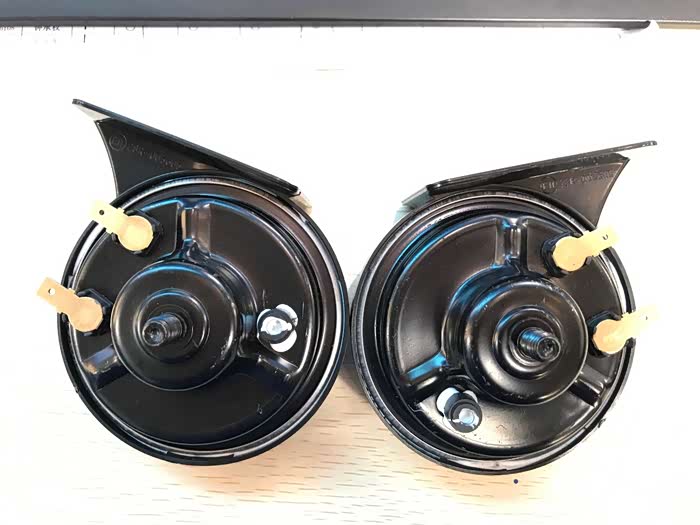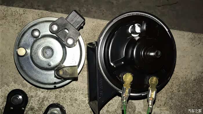 拆完后原车喇叭与蜗牛喇叭对比,蜗牛喇叭比原车的大一一圈,声音肯定也大不少的。