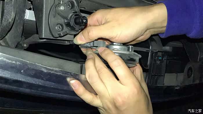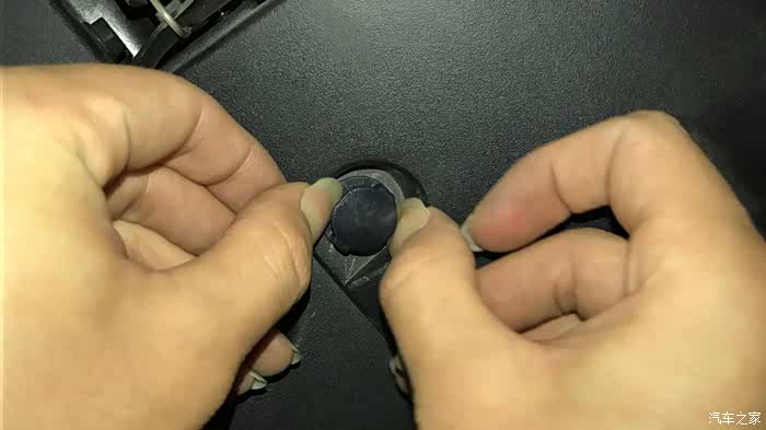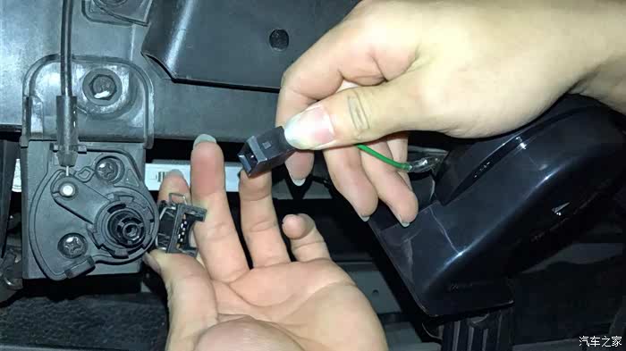 卸下螺栓后找到喇叭线卡扣,按住两边的银色弹簧就可以把插头拔出来了。