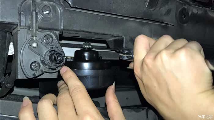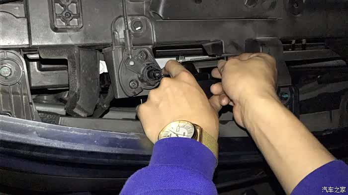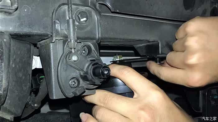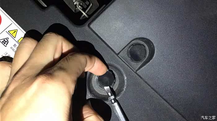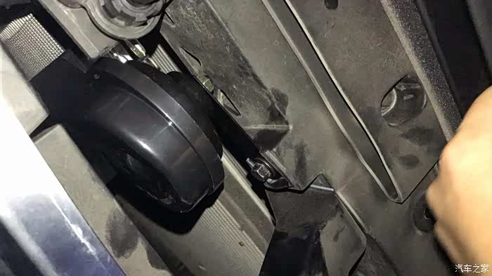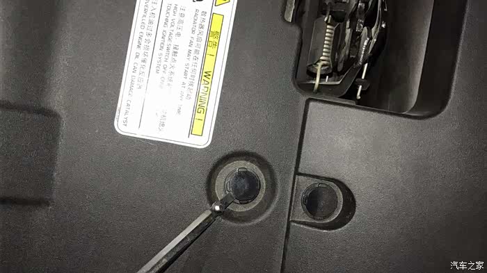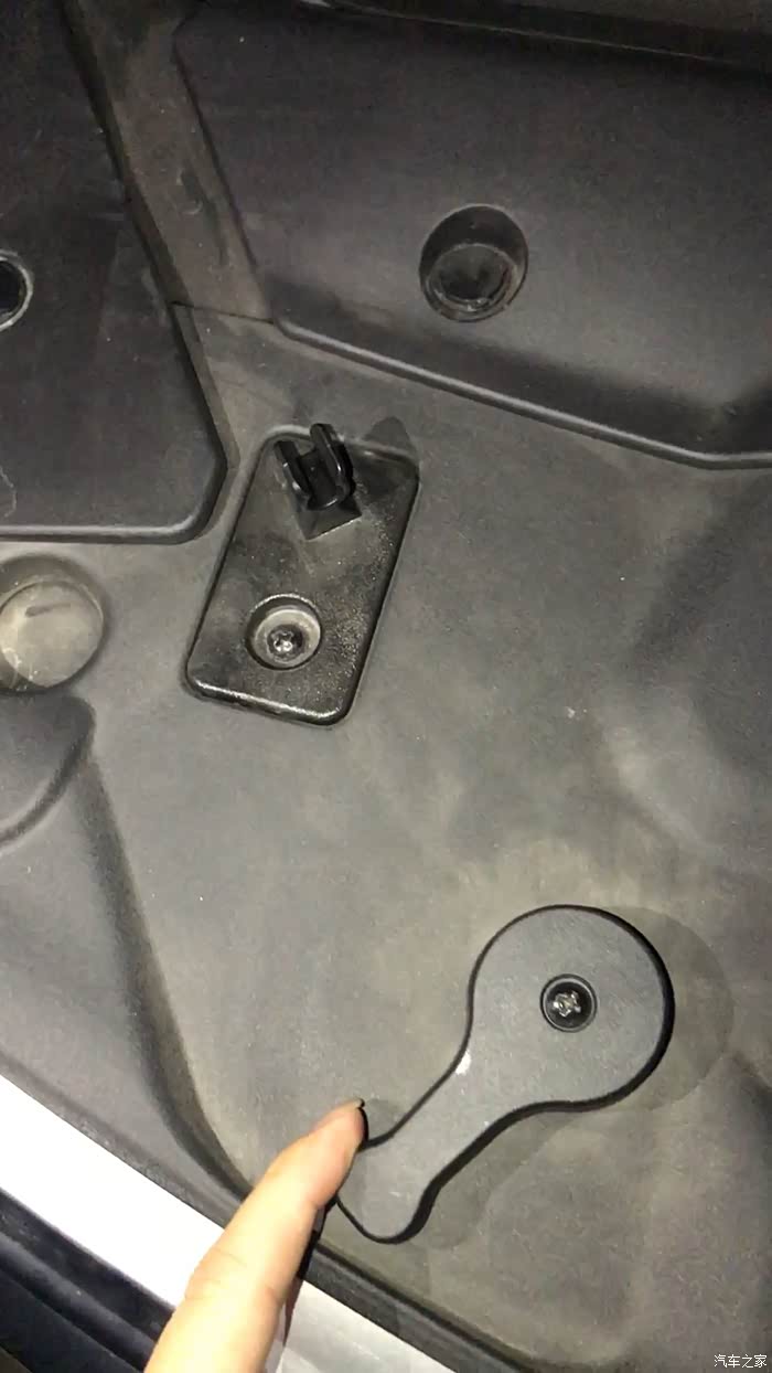 划重点,注意了:卸完卡扣后这里还有两枚螺丝需要拧开,一个是引擎盖把柄,一个是引擎盖支撑杆固定架,把这两个螺丝卸下后轻轻一拿就可以把开关把柄拿下来了,然后就可以拆引擎盖护板了。