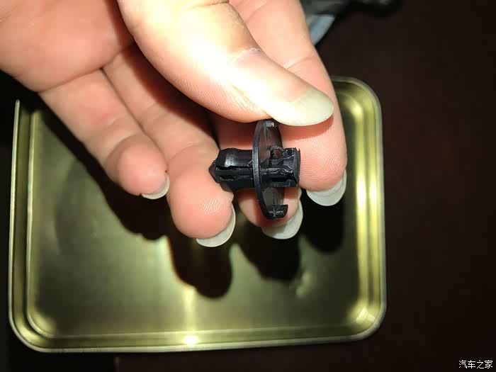 我们只需要拆引擎盖前面车头的护板就可以了,这个引擎盖上大概有十几个这样的卡扣,专门用来固定引擎盖板用的,我们只需要找一把一字螺丝刀轻轻从这个缝隙往上翘就可以了。
