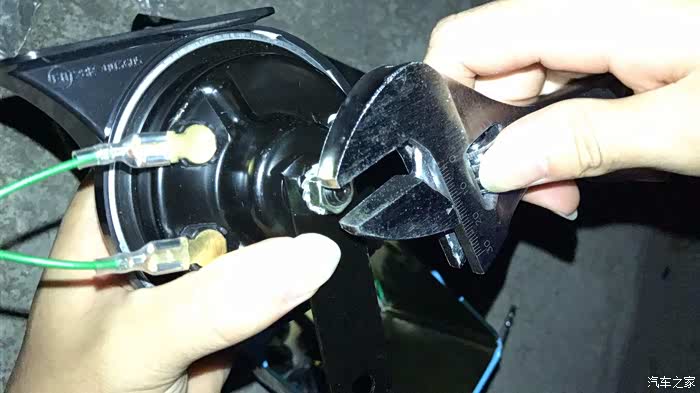 说到这里我们要准备好扳手,如果没有活动扳手就准备两个小扳手,一个M10,一个M16的,16的用来卸喇叭与车固定的螺栓,10的用来卸喇叭固定杆,不然手是拧不开的。