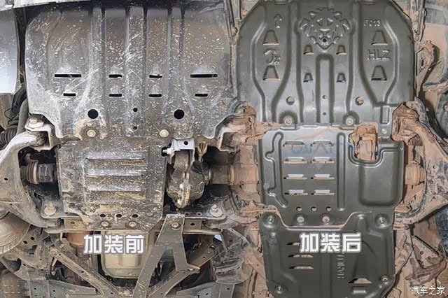 从对比图中可以看出,加装护板对前差速器、变速箱和加力杆进行了更全面的保护。因此建议能加装就加装车是小老婆也是要疼爱的