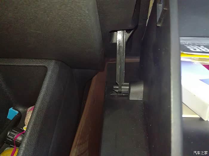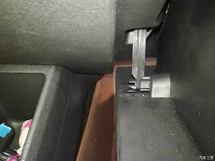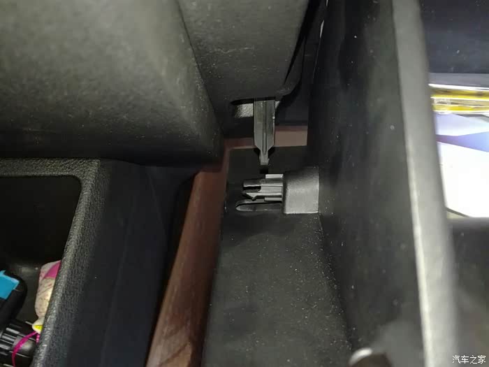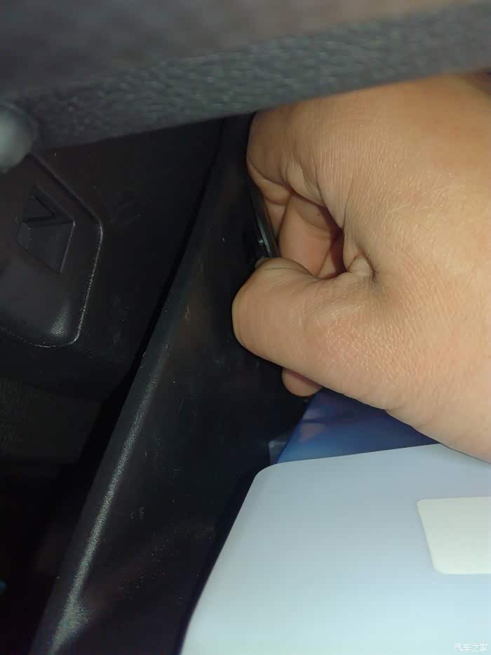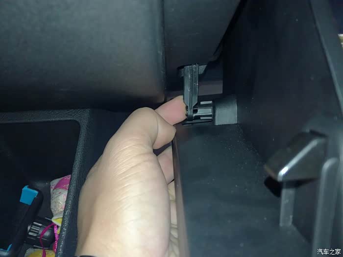 将手套箱推到半开的位置,往外扳这个滑轨的卡扣,一边扳一边往后拉