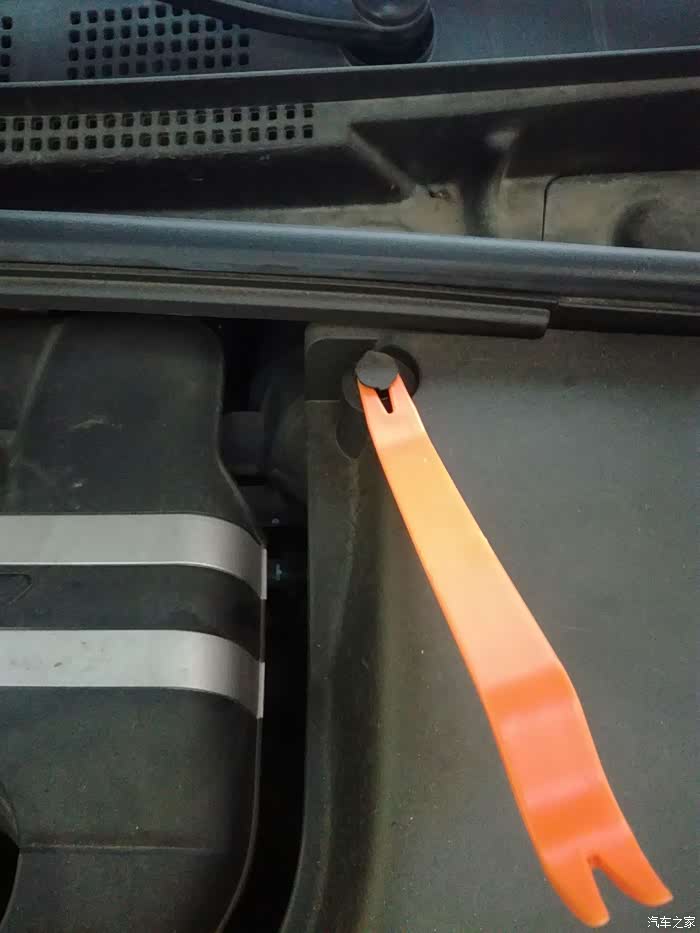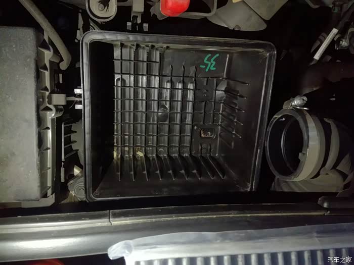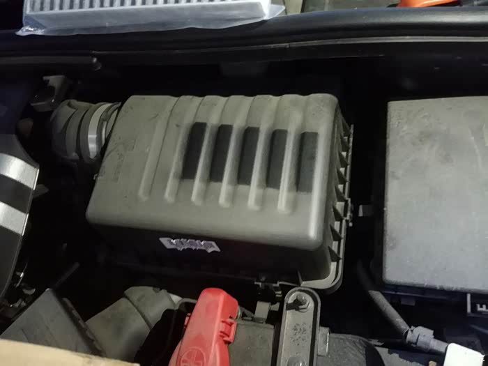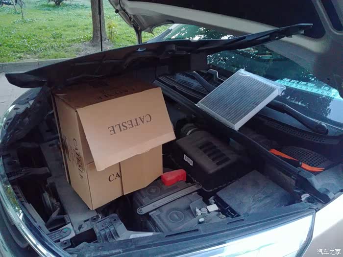 由于空气滤清器在车头右侧部分,我只拆开了一大半,左侧有个引擎盖的锁扣开关,怕拆了装不上。就先找个纸箱垫一下吧