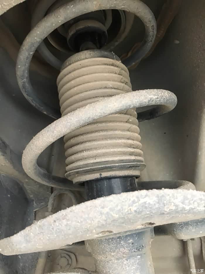 拆掉轮胎发现前避震胶套掉了,难怪异响越来越明显。