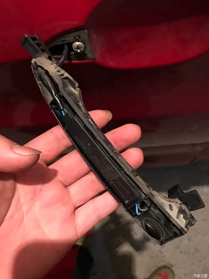 然后就拿下来了,这个把手拆卸是最难的,好紧,我拿一字螺丝刀硬翘开的,门把手着有痕迹了,但真的紧!还好没有裂!把旧的拿下来,新的感应器复位!在还原安装就行。